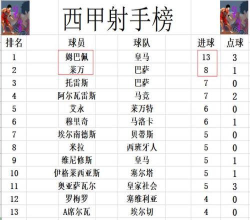 射手榜方面,姆巴佩13球高居榜首,莱万8球位列第2,托雷斯,阿尔瓦雷斯7球并列第3。维尼修斯,伊格莱西亚斯等人5球刚好挤入前十,A席尔瓦今天无力破门,还是差1球才能进前十。