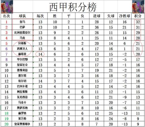 积分榜方面,皇马连续2场爆冷被弱旅逼平,他们的领先优势也被巴萨逐步缩小,先战皇马只领先巴萨1分。另外比利亚雷亚尔和马竞也是一路追赶,比利亚雷亚尔差皇马3分排第3,马竞差皇马4分位列第4。赫塔菲止住2连败颓势后,还是排在第7,暂时只落后第5,第6的贝蒂斯和西班牙人1分,少马竞8分。