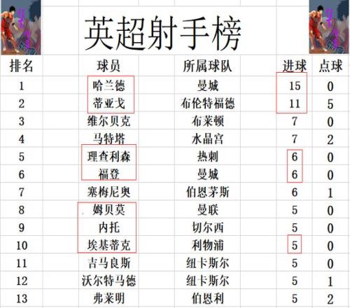 射手榜方面,哈兰德今天没有进球,还是15球领跑,蒂亚戈还是11球紧随其后。马特塔,维尔贝克7球并列第3。福登连连进球,他和理查利森追上塞梅尼奥,6球并列第5。埃基蒂克双响,追上内托,姆贝莫等人5球刚好挤入前十。